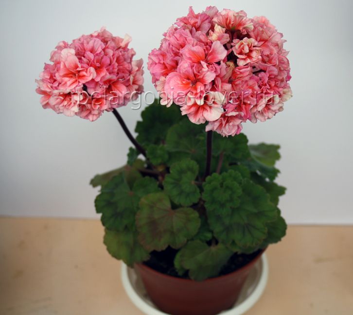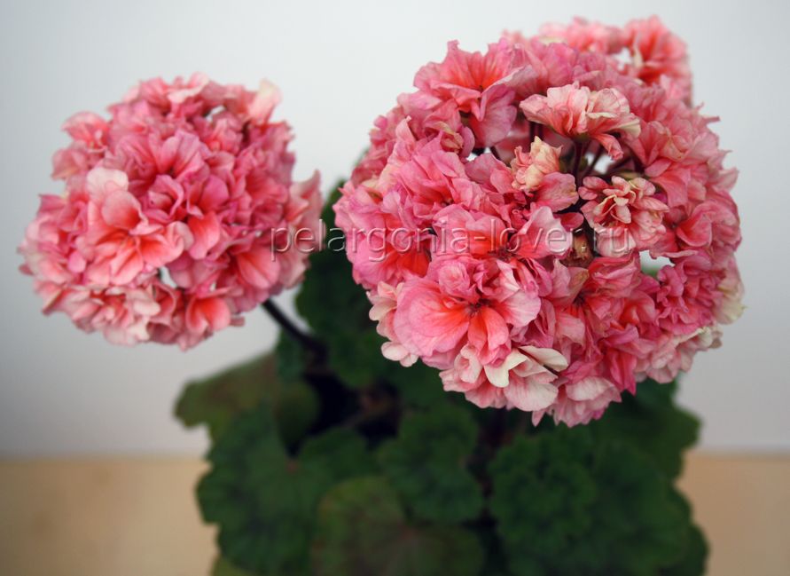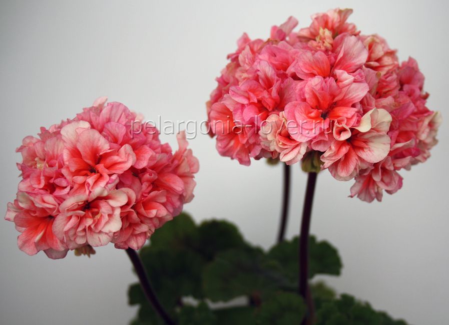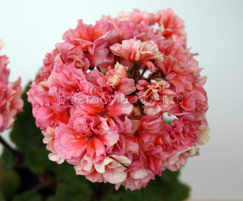 Махровые, с волнистыми лепестками цветы собраны в крупные, пышные соцветия. Цветы с бело-розово-лососевыми переливами, в центре окраска более яркая. Листва некрупная, темно-зеленая. Кустик небольшой, пушистый, формируется самостоятельно после одной прищипки. Цветет охотно и обильно. Красивейший сорт!