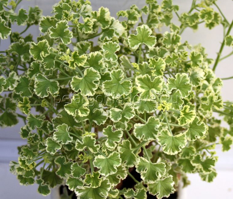 Душистая пестролистная пеларгония с нежным запахом лимона. Мелкая гофрированная зеленая листва с тонким золотисто-белым окаймлением. Чтобы кустик был компактным и пушистым необходимы постоянные прищипки. Душистые пеларгонии лучше себя чувствуют в полутени, не выносят яркого солнца.
