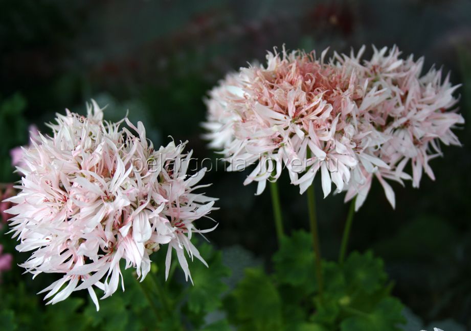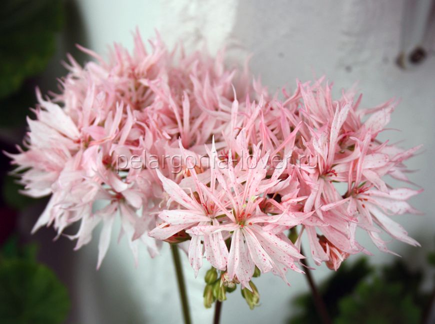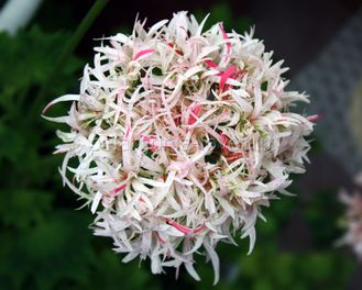 Белые цветы с розовым оттенком, на лепестках розовый крап. Лепестки узкие, длинные, вытянутые. Остроконечная листва с темно-зеленой зоной. Прекрасно кустится даже без формировки растения. Во время цветения куст весь усыпан плотными шапочками помпончиков-ёжиков на крепких высоких цветоносах.
